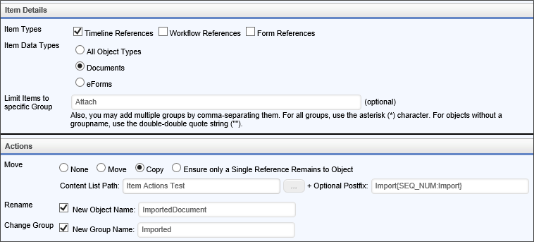 Let us assume that there is an uploaded document in a Group called "Attach" that is attached to a Timeline, and that you'd like to rename the document and copy it to the content list. You could configure the Item Actions Custom Task as shown below: