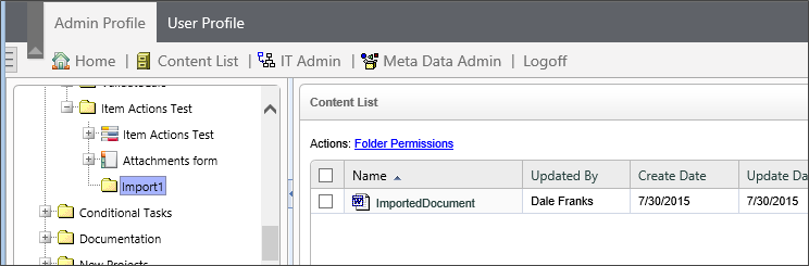 In this case, the uploaded document will be copied into the Item Actions Test folder by creating a subfolder that incorporates a unique sequence number as part of the folder name. The document will be renamed "ImportedDocument", and placed into a group named "Imported. In the content list, after the Custom Task runs, you'll see the new folder and the copied document it contains, as shown below: