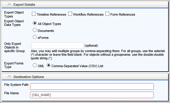 Security enhancements for Process Director v5.0 disable the use of System Variables to configure the Destination Folder property. Additionally, the requirement was imposed that all export paths to a Windows File System must be explicitly listed in the Custom Variables file, through the use of the AllowedExportLocations Custom Variable.