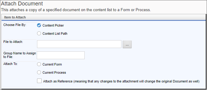 | File to Attach | The document to attach can be selected via a Content Picker control when Content Picker is selected as the Choose File by property. If Content List path string is selected, a text box will appear to enable you to type in the Content List path to the document. Again, in most cases, you'll use the Content Picker. | |