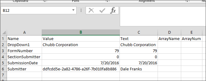 When the CSV option is selected, form instances are exported to a CSV file of the following format. The CSV file stores information about the state of each field in the form instance.