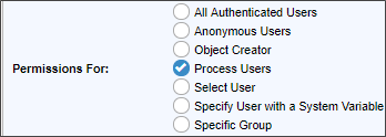 The first five options are preset options to cover the normal user permissions groups that exist in Process Director. The remaining three options (Select User, Specify user with a System Variable, and Specific Group), will, when selected provide an additional control to select the user, or to specify a System Variable or Group Name for whom to set permissions. |