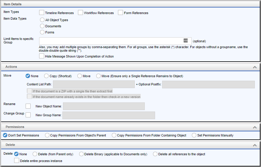 None: Do not move the object. Move: Move the object to a specified Content list Path. Copy: Copy the object to a specified Content list Path. Ensure only a Single Reference remains to Object: Remove all references to the object except for the object that resides in the specified Content List Path. |