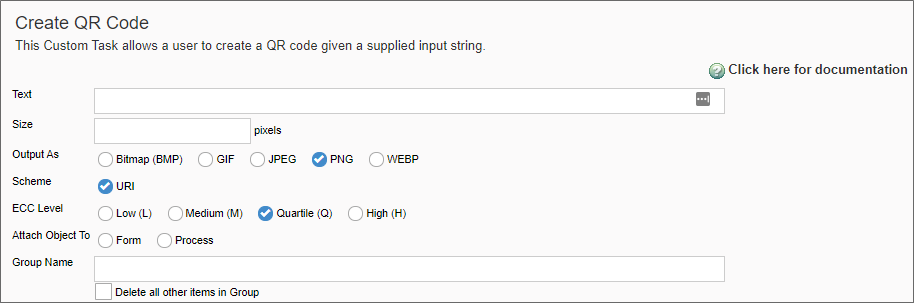 This Custom Task will generate a QR Code image when used in conjunction with a BP Logix Image control. This Custom Task requires Process Director v5.44.500 or higher to work, since some additional application files are required for the product to produce the QR code image.