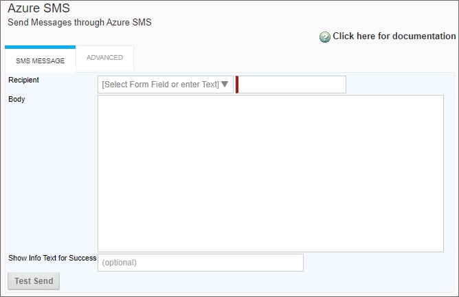 The mobile number to which to send the SMS Message. This number can be selected from a Form field, using the dropdown control, or by entering text in the provided text box. If a Form field is selected from the dropdown control, the text box will be hidden. Otherwise, the text field will accept a phone number or a system variable that returns the phone number. Any phone number string must conform to the E.164 format (full country code, starting with “+1” for U.S. numbers) for Azure SMS to accept it. |