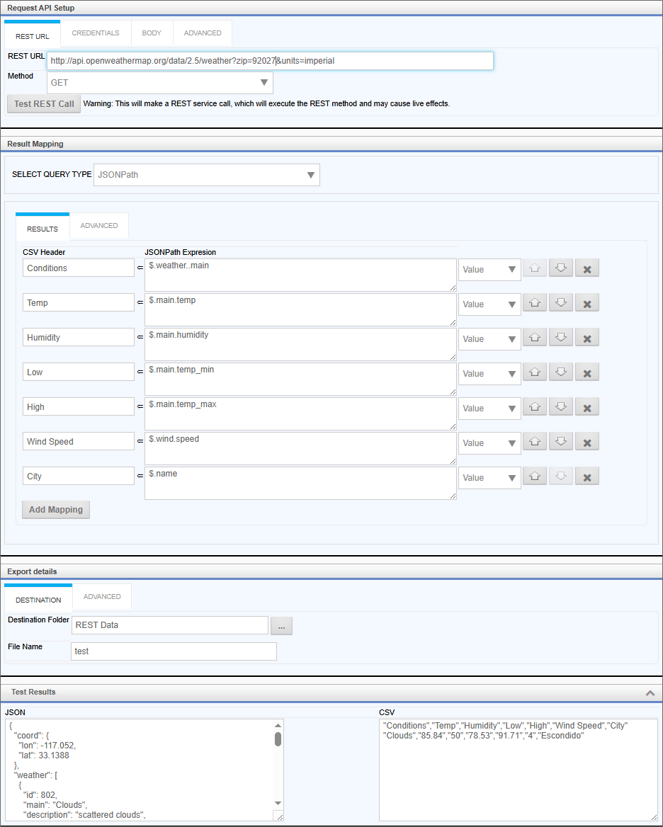 | CSV | The CSV text that will be exported to the file. | This field is filled automatically when the Test REST Call button is clicked. This field will be blank until you supply the appropriate column mappings in the Result Mapping section of the configuration screen. |