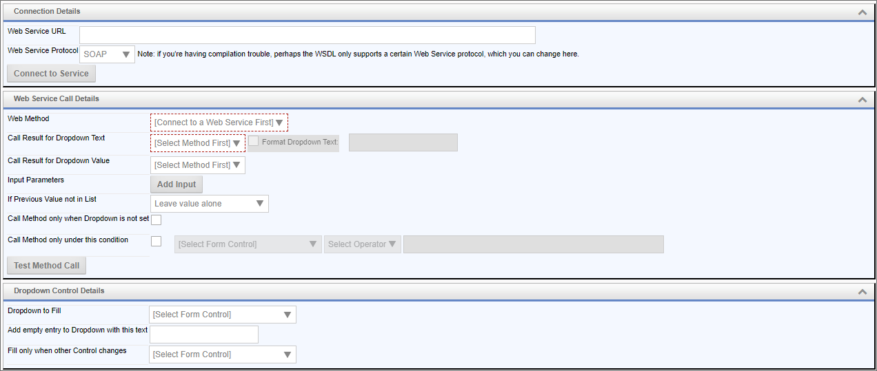 Once you select a web service method, the appropriate parameters for that web service will appear in the configuration screen. You can then map those parameters to fields from a Form.