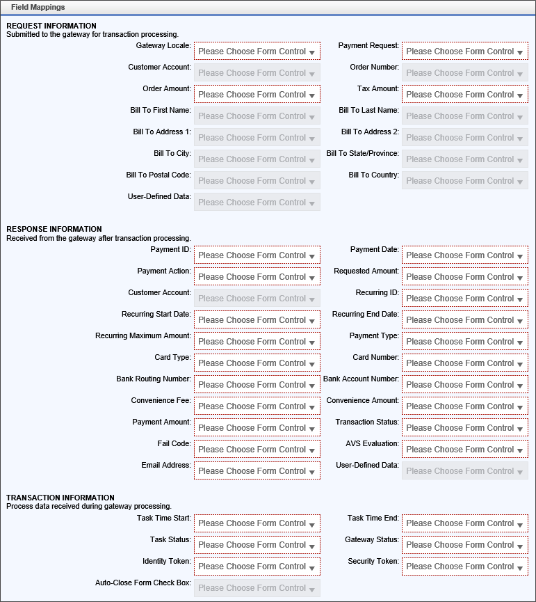 We have included the Process Director application “Payment Gateway Demo” for your use. It is the application we used during the development of this Custom Task. It presents all possible fields without regard to fields that may be enabled or disabled through Custom Task configuration. The Demo is located in the most recent version of the [Samples] folder that contains the sample files compiled by BP Logix. The Samples are available for download from the Downloads page of the BP Logix Support site.