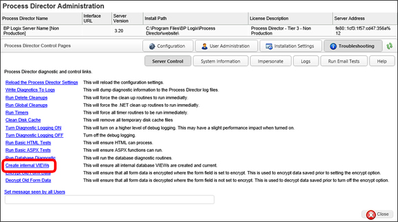 A user with IT Admin access can create an internal SQL View in Process Director’s database. The views will be created on the database after clicking the Create Internal VIEWs link on the IT Admin’s troubleshooting page.