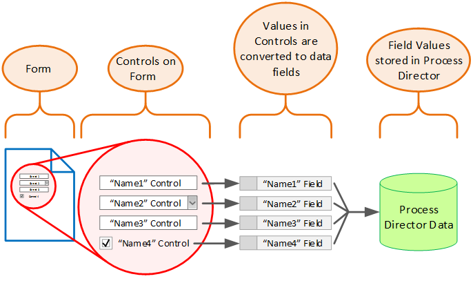 When you place a control on a Form page, Process Director also creates a data field that is bound to that control. Process Director uses this data field to store the value that users enter into the control when they submit the Form. As an example, there may be a textbox control named FirstName in a Form. When you enter a name into the control and submit the Form, it is saved to the FirstName field in Process Director. Because the form control and the form field are so tightly bound, we will use the terms ‘form control’ and ‘form field’ interchangeably.