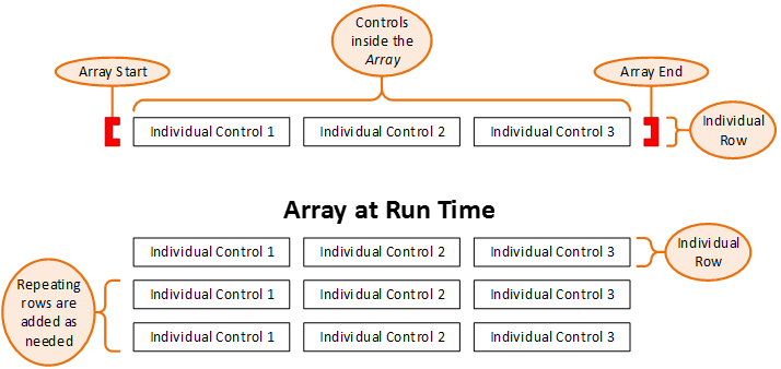 The Array is similar to the Section in that there are separate Array Start and Array End controls, and all of the controls placed between the Array Start and Array End controls become part of the array. Arrays are always configured inside of tables, and the Array Start and Array End controls must be in the same table. The Array Start control must be in the first column of the table, while the Array End control must be in the last column. Unlike the Section, an Array can't have a nested Array. An Array can also span more than one table row, so a single "row" of an Array can take up two or more table rows.