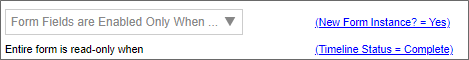- Think carefully about when the Form's data fields should be editable by users. There are two properties on the Properties tab of the Form definition that control this: Form Fields are Enabled Only When and Entire Form is read-only when. In general, Form fields should be enabled for new form instances, but disabled in all other contexts. If form information does need to be edited, specify the field that should be edited during the process, and when editing is to be allowed, via visibility conditions on the appropriate fields. Section controls are extremely helpful here, because you can place the editable controls in their own Section, and enable or disable the Section control to enable/disable its constituent controls. Similarly, once the process is complete, the entire Form should be set to read-only, so that it cannot be edited after the process has completed.