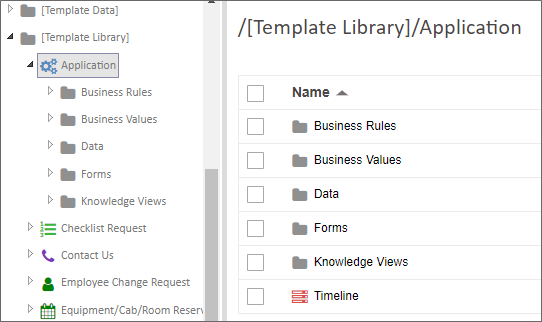 - Create an application stub in the Template Library that contains all of the base objects you'd normally create for any new application, e.g., a Form and Process Timeline that are correctly linked, along with a default email template. This enables you to provide all of the initial applications objects, along with any desired Form styling or layout, to enable all new applications to inherit a desired look and feel. This stub should also include the common organizational folders for applications objects, such as Knowledge Views, Forms, etc. Create new applications directly from this stub. The example below shows an application stub built into the Template Library.