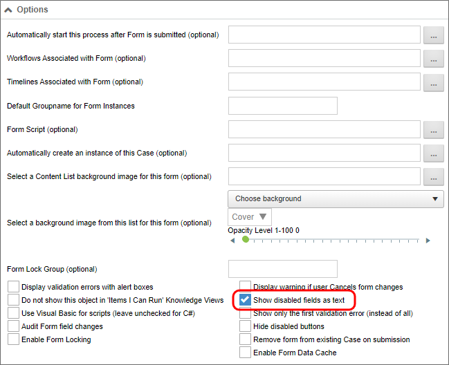- When possible, choose the Show disabled fields as text option in the Form definition, which will render disabled fields as plain text, rather than disabled controls.
