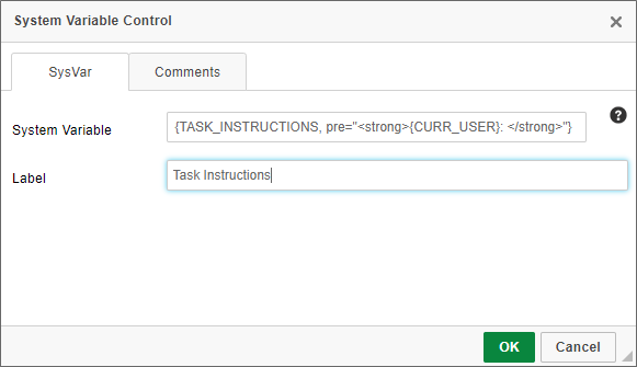- Always add the assigned user and task instructions at the top of forms and email templates. In a task context; the easiest way to be sure of that is to use the System Variable control, and set it to use the Task Instructions System Variable, which only appears in that context. You can append the task user's name to the control by typing "