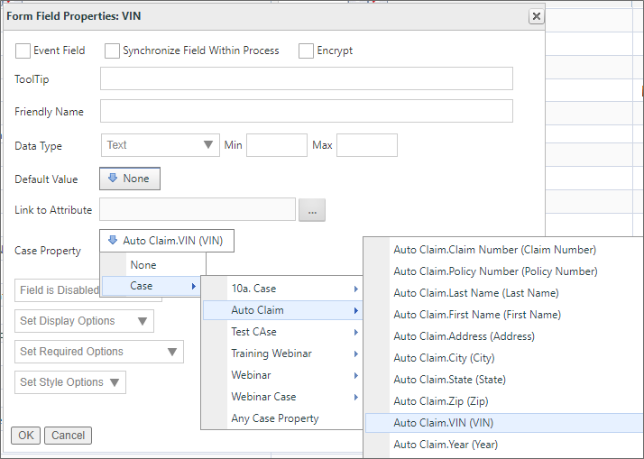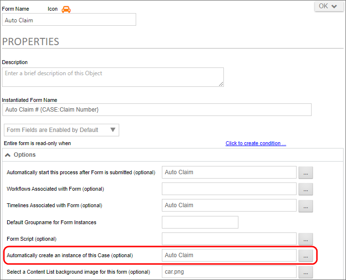 For illustrative purposes, this topic will display elements from a simple, notional Case Management Application, with examples of how the various objects are configured to work with the Case. In our sample case, we will track an automobile insurance claim, and will link three different processes as part of that claim: