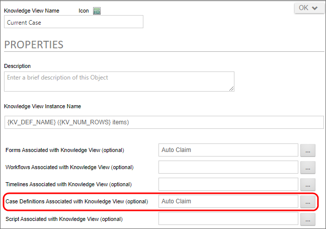 On the Properties tab of a Knowledge View, you can associate a Case with Knowledge View by choosing the desired case from the Case Definitions Associated with Knowledge View (optional) property.