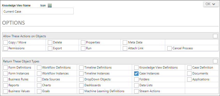Next, in the Options tab of the Knowledge View definition, You can configure the Knowledge View to return Case instances. When you do so, clicking on a Case instance in the Knowledge View's results will open the case instance in the Case Dashboard you configure.
