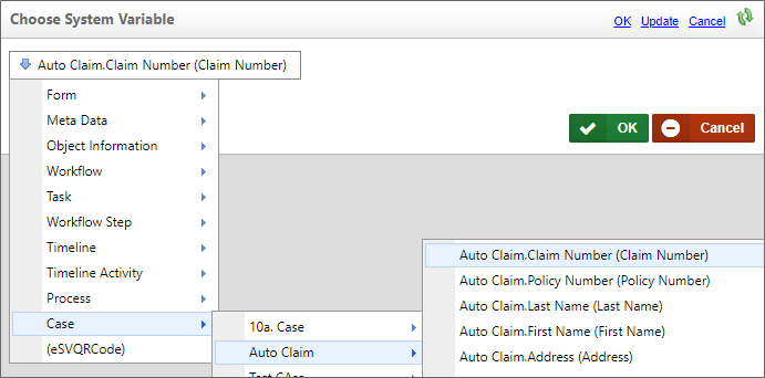 Indeed, the Case properties automatically appear in the Choose System Variable dialog box for use in the Condition Builder.