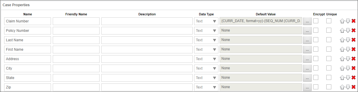 In this example, the Auto Claim case contains a Claim Number property, which uses a formatted sequence number as a default value, and which creates a unique identifier for the Auto Claim instance. A number of the properties, such as the VIN number, make, model, and year, of the vehicle, as well as the Customer's contact information, contain information that will change over time. For instance, over the course of several years, the customer may add or remove vehicles for the policy, or may move to a different address. Finally, there are fields such as the Adjuster's Name or the repair estimate amount that are only relevant to this specific Case instance.