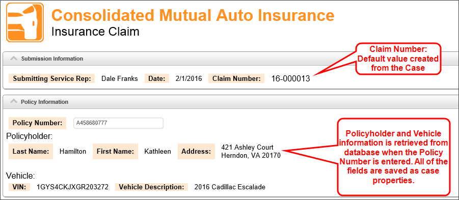 The Auto Claim Form for our sample auto claims application uses case properties extensively. In our sample application, policyholder information containing the customer's contact and vehicle information are extracted from an external data source, and filled into the form automatically when the user enters a policy number.