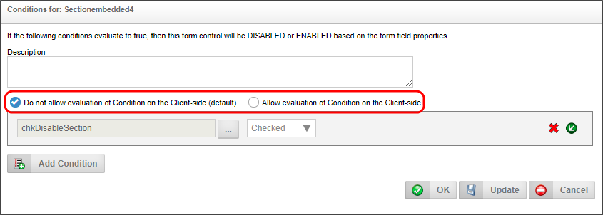 When this client side condition flag is enabled, system variables will only be evaluated once on the server when the page is displayed or an event occurs. Form fields, however, will always use to most current form data on the visible form when evaluating the condition, because the evaluation will take place in the client browser, and will not require the form to be reposted to the server to evaluate the form fields.