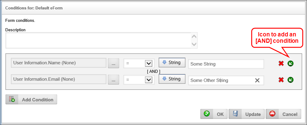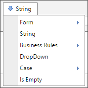 Depending on which item you select from the dropdown menu, the appropriate selection or input method, if necessary, will be displayed in the Condition Builder to enable you to enter the appropriate comparison value. For instance, if you select a "String" as the desired comparison value, a text box will be provided into which you can type the string value you desire.