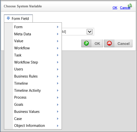 All of the system variables are organized in a dropdown menu that divides the system variables into a number of categories, as shown above. Use the dropdown menu to select the appropriate system variable. Once you've selected the system variable, click the OK button to close the dialog box and set the system variable in the condition row. Please see the System Variables Reference Guide for a description of all the possible system variables that may appear in the dropdown. This dropdown menu is context-sensitive, so, depending on where you are using the Condition Builder, different options will appear that are relevant to the selection or filtering operation you are conducting.