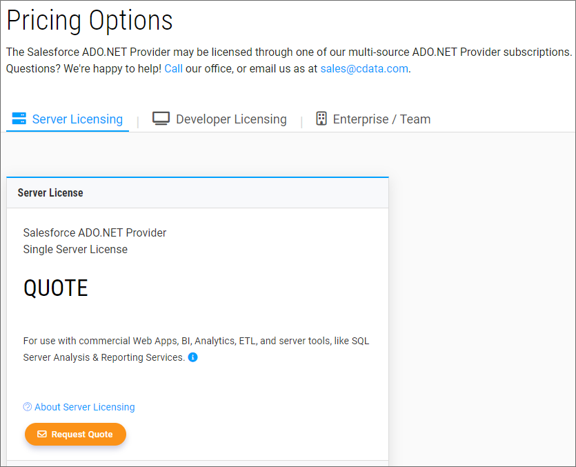 Customers who wish to use data connections to Salesforce, using the appropriate Datasource object, must first obtain an appropriate Open Data (oData) connector to SalesForce from CData. Salesforce oData licenses can be purchased from CData's web site, using the Server Licensing tab.