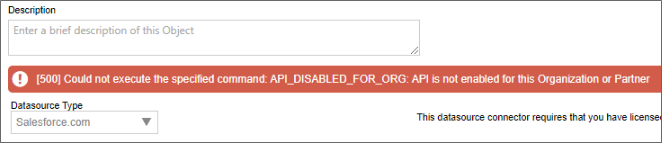 You must have a valid Security Token from CData in order for your Salesforce Data Source object to connect with your data. In addition you must also request API Access from Salesforce, separately, since API Access is disabled by default in the Professional Edition of SalesForce. Please refer to the SalesForce web site for more information about requesting API Access.