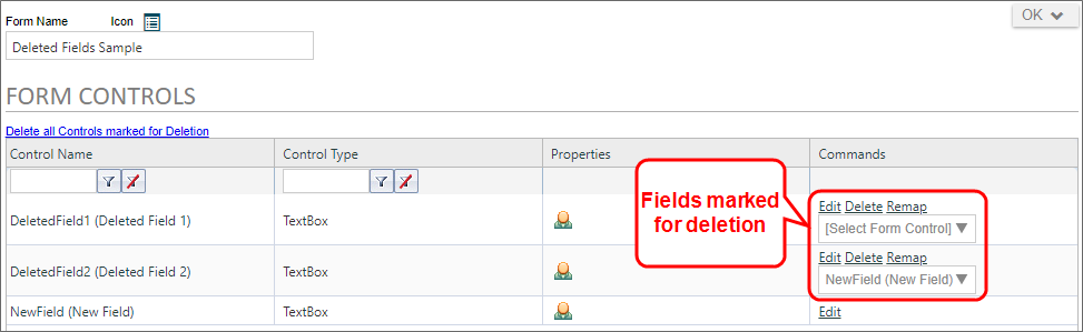 The second step, therefore, is to navigate to the Form Controls tab of the Form definition to specify how to handle this orphaned Form field data. Controls that have been removed from the design surface of the Form are shown as being marked for deletion on the Form Controls tab.