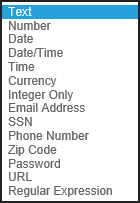 Setting the data type will enforce that the form field accepts data formatted as the appropriate type. The Data Type can be any of the following: