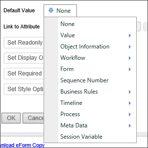 You can specify the default value of a form field. The Default Value dropdown allows you to select from a list of common default values, like Timeline Instance Names or the results of Business Rules. You can also specify the default be set to a custom value or result from a System Variable.