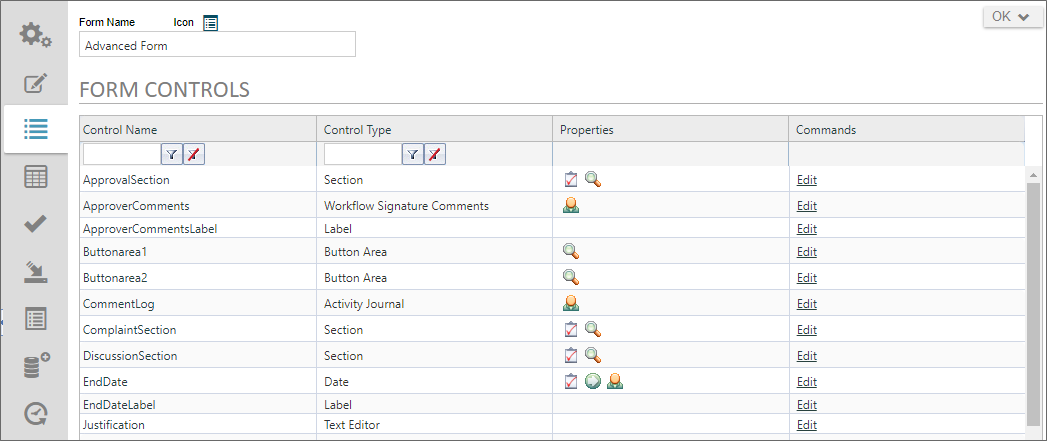 - Open Form Definition and click the the Form Controls tab. In Debug mode, the Form Controls Tab will look slightly different.