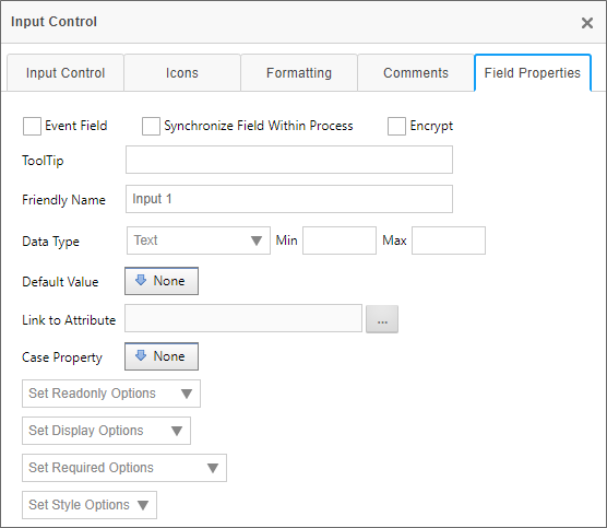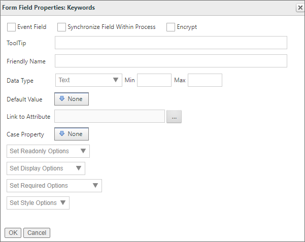 On the Form Controls tab, the Form Field Properties dialog box for each form control can be opened by clicking the Edit link for each control. The dialog box enables you to configure the properties of each form field. You can configure the form field’s tooltip, its friendly name, the minimum and maximum values it can hold, as well as under what conditions the form field will be enabled, viewable, or required. You can also configure the form field’s default value, data type, and attribute to which it links. Different form field types may have some subset of the properties below, as not all field types have the full set of properties. In general, however, the full set of form field properties are listed below.