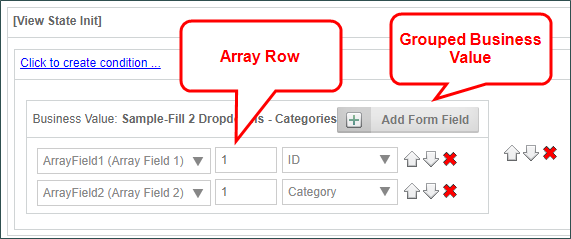 It is possible to return data from multiple Business Values in the same event, and Process Director will concatenate the values from multiple Business Values into a single Array change. Process Director will append the number of rows that corresponds to the largest number of results from any Business Value Property in the same Condition Set. With Business Value Properties that return different numbers of results, the Set Form Data will set no data in fields in the appended Array rows that have no corresponding result. In other words, if one Business Value property set returns five rows, and a second returns four rows, then Process Director will append five rows to the array, but the fifth row will have no value from the second Business Value.