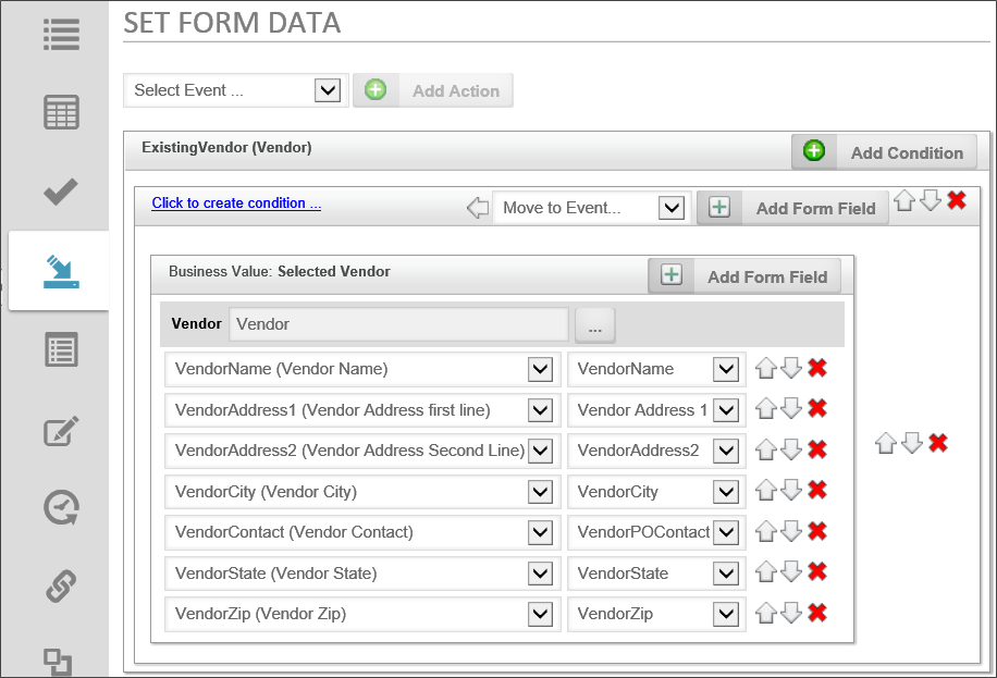 - Click the Add Condition button. A new mapping section for the condition will appear in the tab. You may optionally add a condition by clicking on the Click to create condition link, then using the Condition Builder to define the condition. If you don't define a condition, the Set Form Data action will occur every time the event fires.