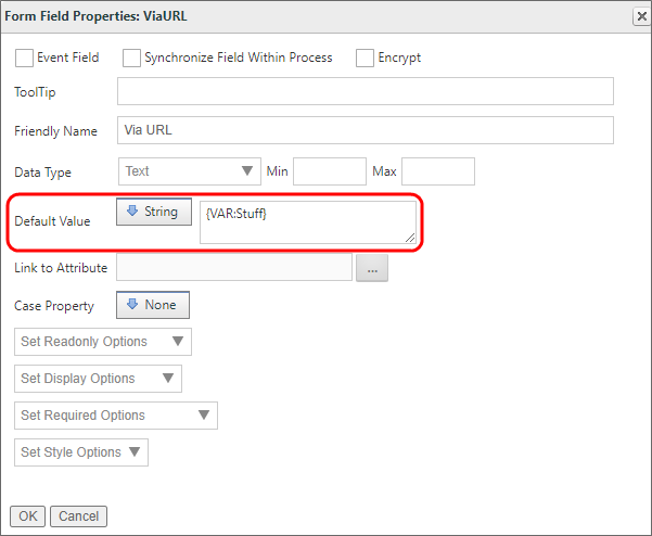 - Set the default value to a string, and enter a generic variable into the field, using the syntax
