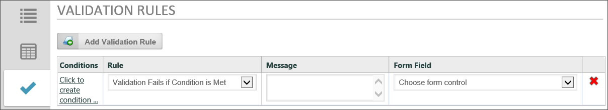 By clicking on the Add Validation Rule button you can add your own validation rule. You can create a condition under which each validation rule will run. If that condition is met—or, not met, as you desire—you can display a custom validation error message.