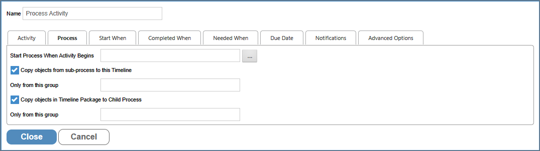 In addition to the common properties tabs that appear for all Timeline activities, the configuration settings below are unique to this Activity Type.