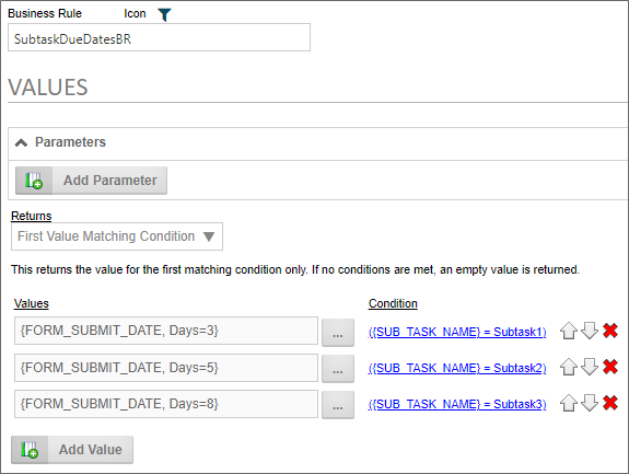 In this example, the Business Rule, named SubtaskDueDatesBR, will return one of three different due dates, based on the name of the Subtask, e.g. "Subtask1", "Subtask2", or "Subtask3". On the Due Date tab of the Timeline Activity, this Business Rule is reverenced in the Set due date from system Variable property to provide the appropriate due dates for each subtask.