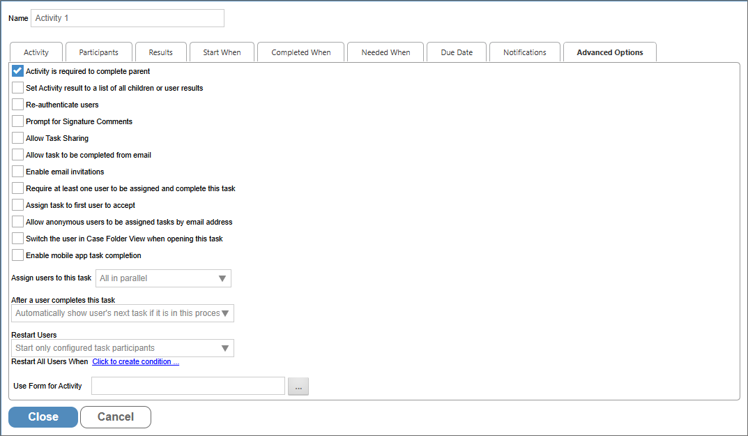 This tab provides many additional settings for controlling task assignment, completion, Activity restarts, and more, as described below.