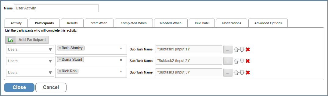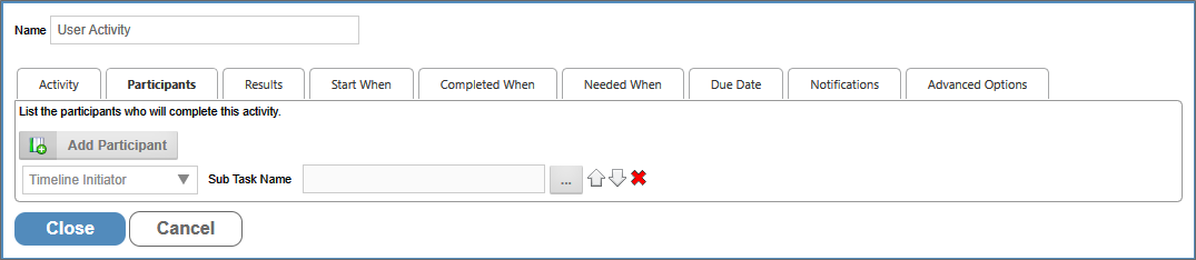 Determines which users are a participants of the user task. Users can be added via the Add Participant button, and the participants can be specified via the Participant Type dropdown.
