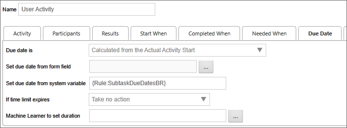 The standard options for the Due Date tab are described in the Due Date Tab section of the Timeline Activities topic. The User Activity Type also has an additional option specific to the User Activity Type.