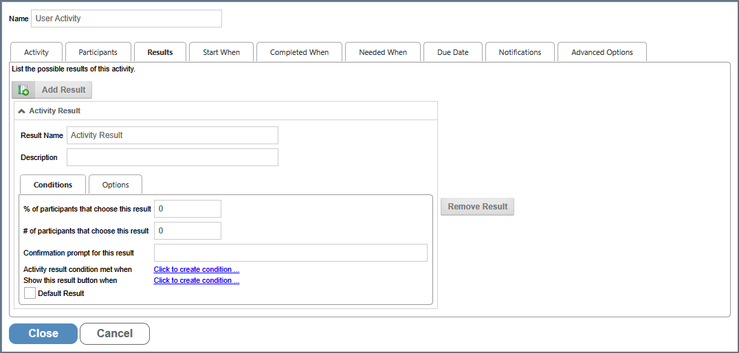The Results Tab appears when either the User or Wait Activity Types are selected. The Process Activity also has a result, which is generated automatically, and is explained in the "Results of a Process Activity" section below.
