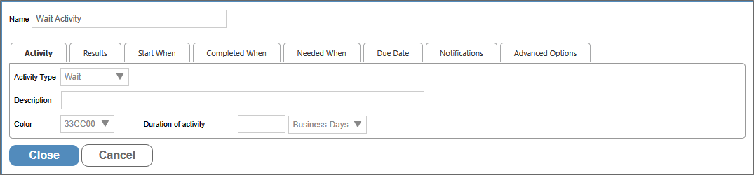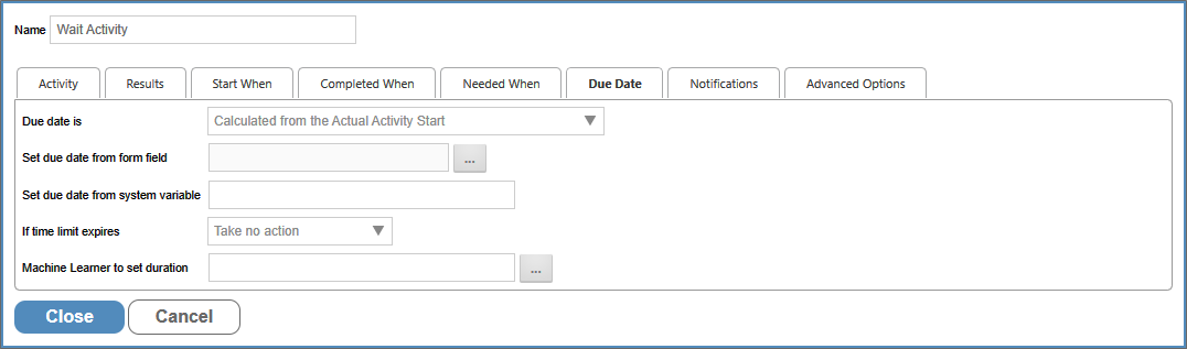 Enables you to specify the length of time to wait, and/or to set the calculated due date. Any time-related Wait Activity must have a Duration set. If no Duration is set, the Wait Activity will automatically complete, unless a condition on the Completed When tab is set.