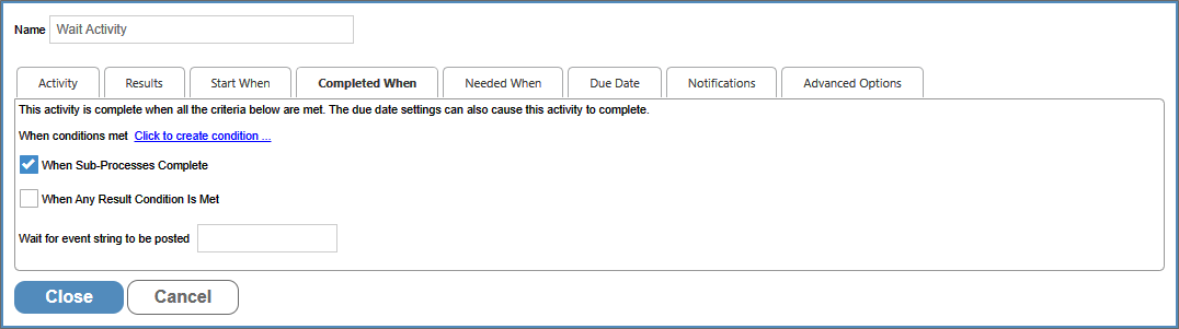 The Completed When tab enables you to specify condition-based criteria for determining the length of the Wait Activity. The following options are available: