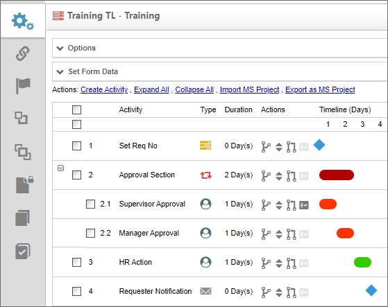 Process Timeline Definitions in Process Director are a series of logical activities, each with a specific task and assigned participants. The Process Timeline defines the path or route that a Form or document must take. Each Activity in the Process Timeline path defines the task type, the participants, and the rules that govern how the Process Timeline will advance or transition to the next Activity.