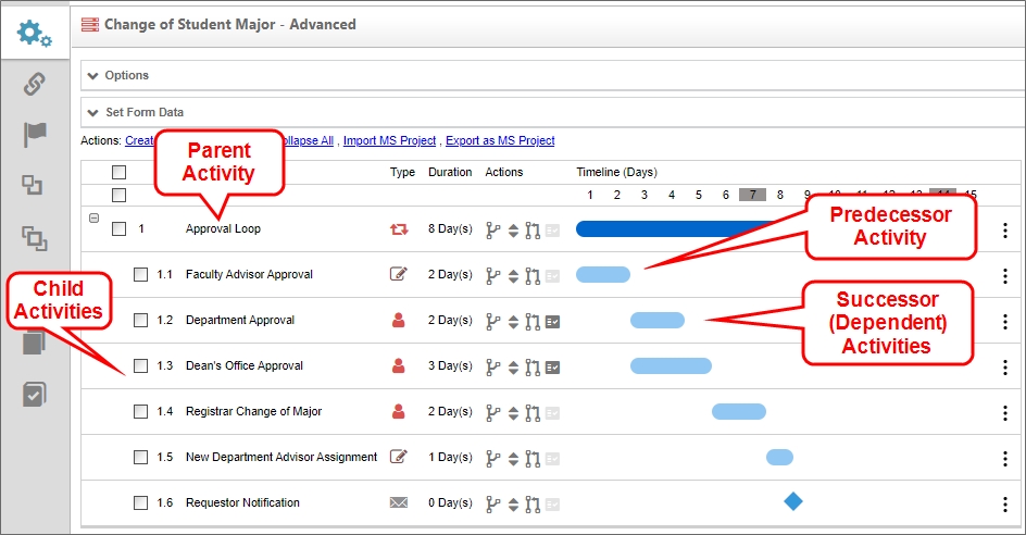 Below is a sample Process Timeline, consisting of several activities. The Timeline column of the Process Timeline shows the number of days planned for each Activity. Faculty Advisor Approval is scheduled to take two workdays, Department Approval is expected to take three workdays, and so forth. All of the activities will be tracked for start times and due dates, and successor, or dependent, activities will begin as soon as their predecessor activities end, via the automated process that's governed by Process Director. The Registrar Change of Major Activity is dependent on the Dean's Office Approval. The New Department Advisor Assignment Activity, in turn, is dependent on Registrar Change of Major.
