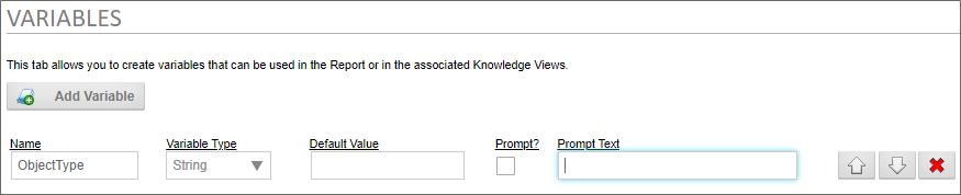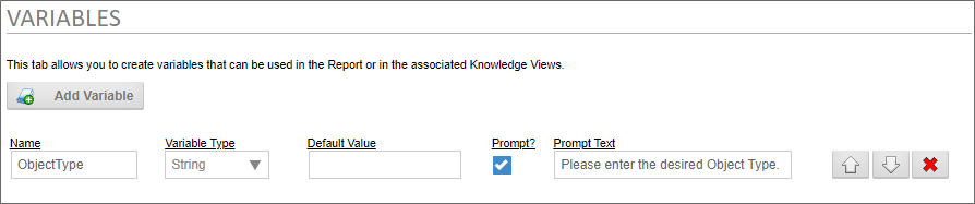A report can prompt the user to provide a variable's value when the report runs. To make this work, we'll need to configure the ObjectType variable to prompt the user.